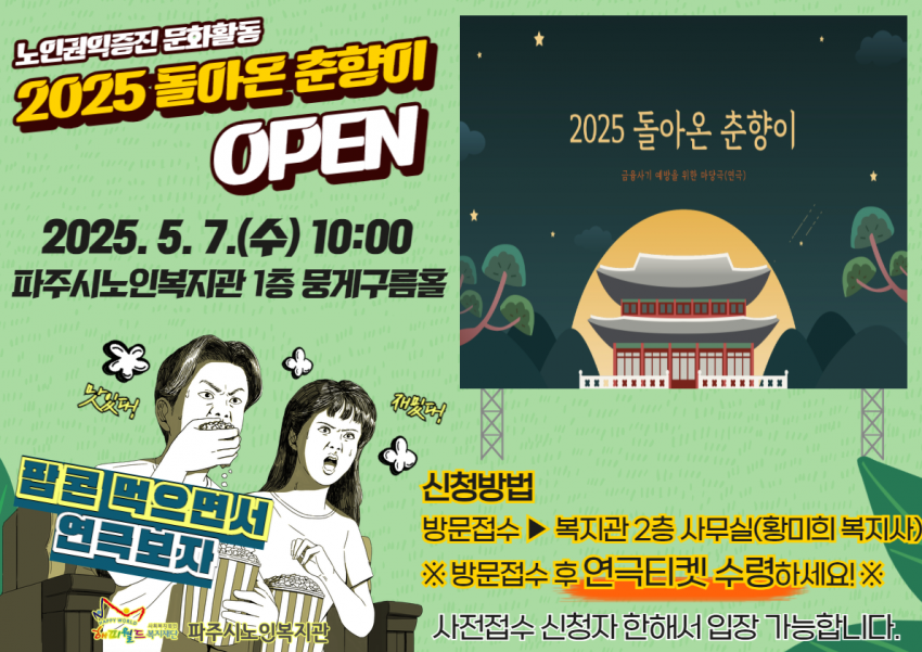 목록 모집완료 노인권익증진사업 문화활동(금융사기예방 마당극) 참여자 모집 페이지 정보 황미희 조회 1,125 입력 2025-04-23 11:00 댓글 0 모집시작일시 2025년 04월 23일 00시 00분 모집시작일시 2025년 05월 07일 10시 59분 본문 목록 이전글뿌셔뿌셔! 카카오톡! 1기 참여자 모집 2025.04.23 다음글[노인상담]노인우울예방 교육 '거울아!거울아!' 2025.04.16 댓글 0 댓글목록 등록된 댓글이 없습니다.