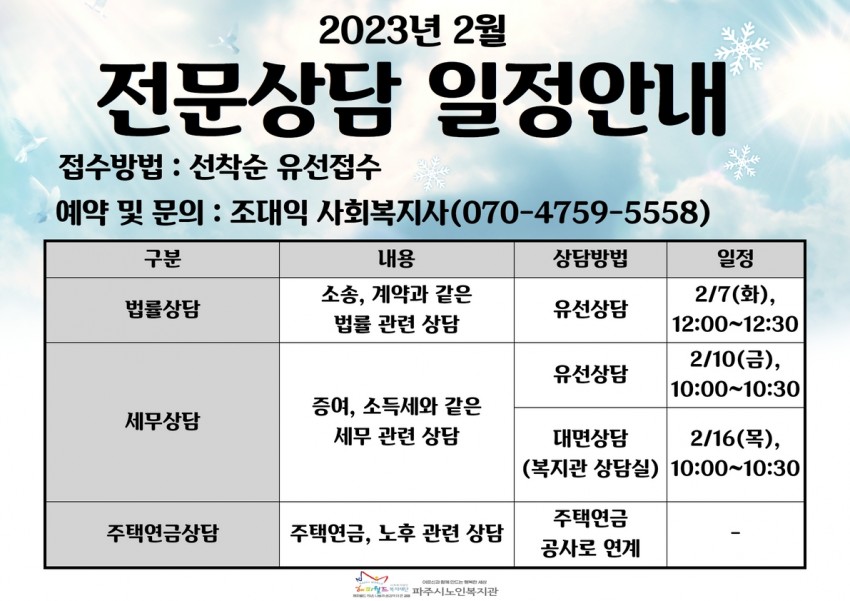 목록 모집완료 2월 전문상담 일정 안내 페이지 정보 조대익 조회 3,609 입력 2023-01-16 10:50 댓글 0 본문 목록 이전글이미용 이용안내 2023.01.16 다음글건강증진실 이용안내 2023.01.06 댓글 0 댓글목록 등록된 댓글이 없습니다.